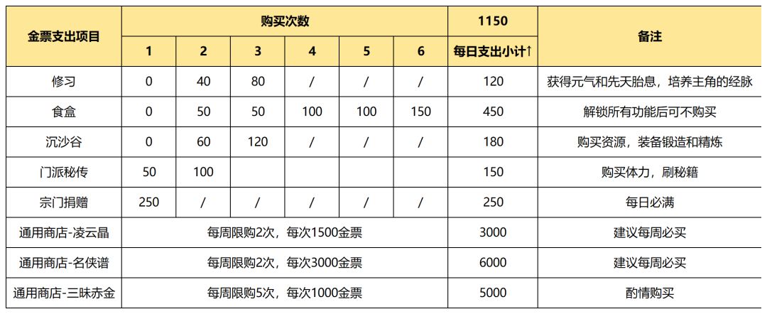 如上图示,未解锁全部玩法前每天需要支出1150金票,解锁后可以不买体力食盒,每天稳定支出700金票,一周是4900金票。