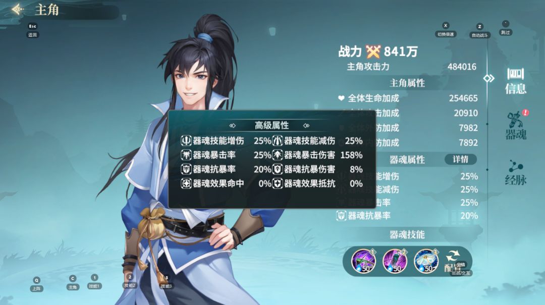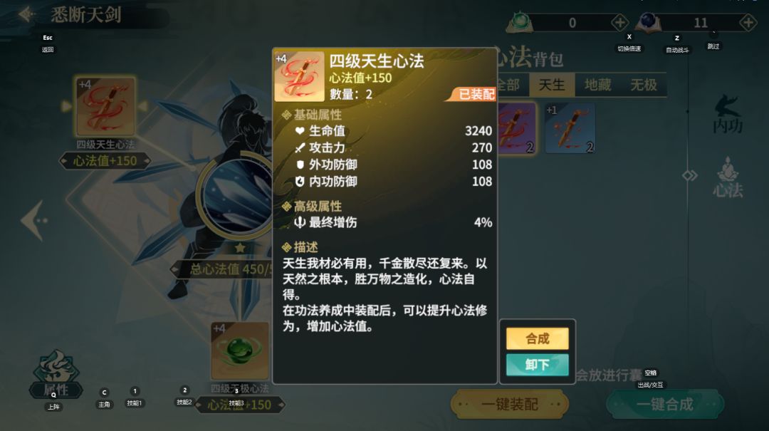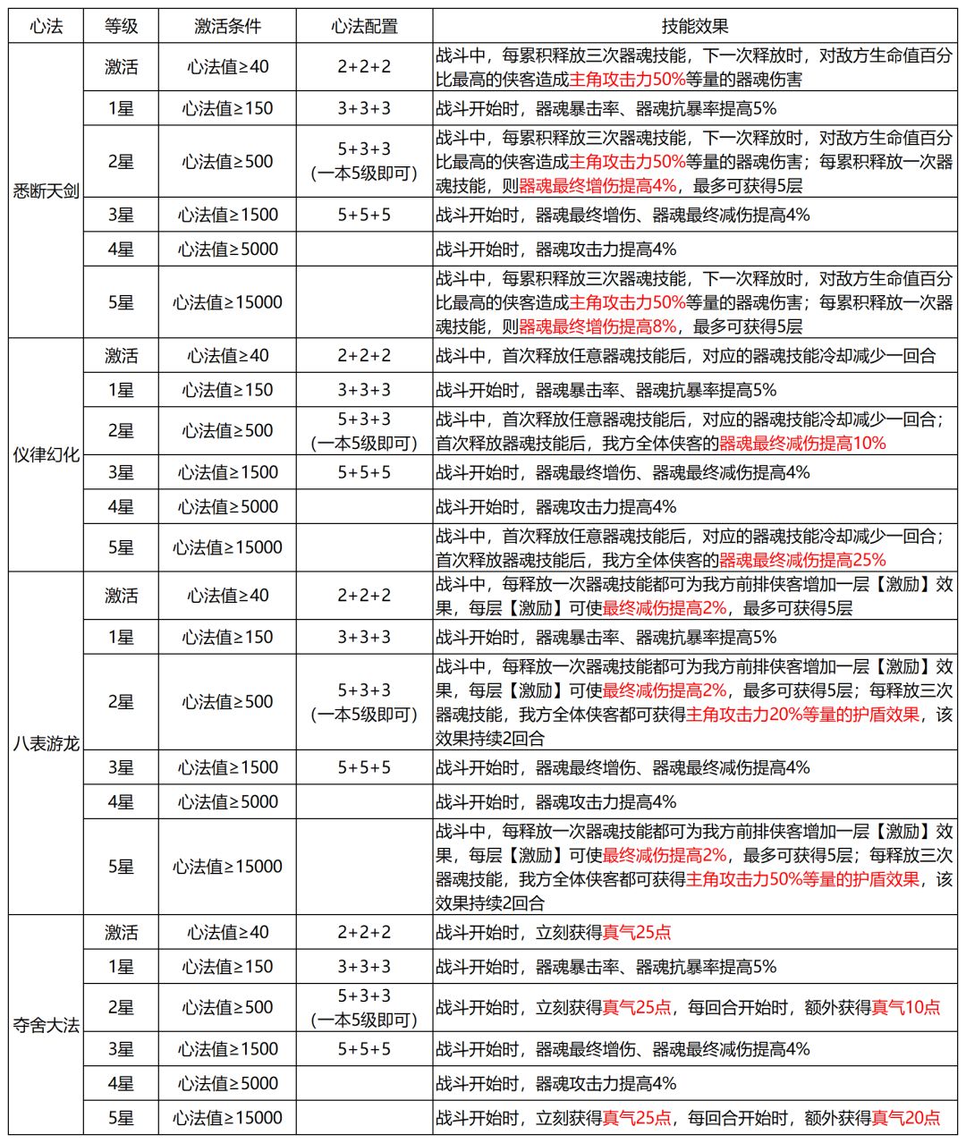 1)心法养成:每门心法可装配三款心法,每款心法都能增加基础属性(攻击、生命、内外防),其中天生心法提高最终增伤,地藏心法提高最终减伤,无极心法提高器魂技能增伤&器魂技能减伤,合成优先级天生>地藏>无极。三款心法的等级越高,获得的心法值就越多,从而使心法技能的星级越高。