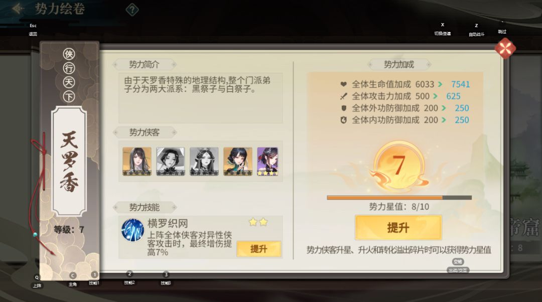 每名侠客都有自己的势力归属,势力中的侠客升星、升火和转化溢出碎片可以获得势力值,提升势力等级,增加全属性。