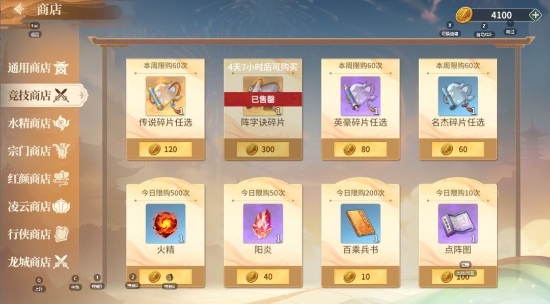 - 竞技商店:每周换满传说碎片和阵法碎片,其余根据竞技币余量酌情,个人比较推荐优先换点阵图和白乘兵法,通过升级阵法来提升自身整体属性(阵法修炼,每重会激活特性,提升攻击力、防御值和生命值百分比,每阶/每级提升属性)