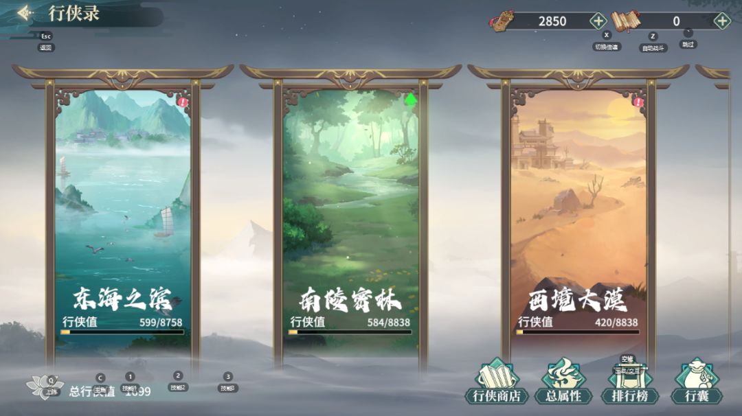 所有玩法中最后解锁,我记得好像是46级解锁的。行侠录共有4张地图,每张地图可消耗相应侠客的侠客令(通过【四海争流】和【行侠商店】获得)去激活与升级,从而获得属性和行侠值。每张地图有2个技能,达到对应的行侠值后消耗名侠谱可升星(凌云商店兑换,优先级高;其他活动可兑换也建议优先考虑)。