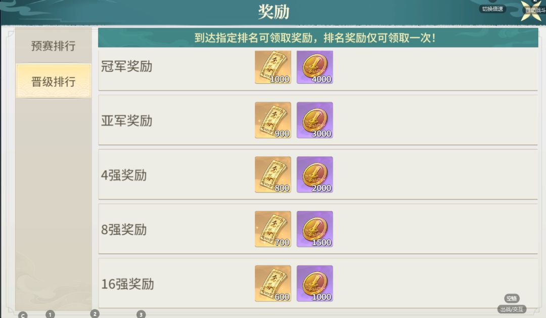 试剑争锋可以获得晋级排行奖励和预赛排行奖励。只要进入16强,每天都可以获得600金票,相当于大月卡(独狼区福利)!预赛排行可以获得竞技币、点阵图和百乘兵书,排名越靠前,奖励越多(强者越强)。