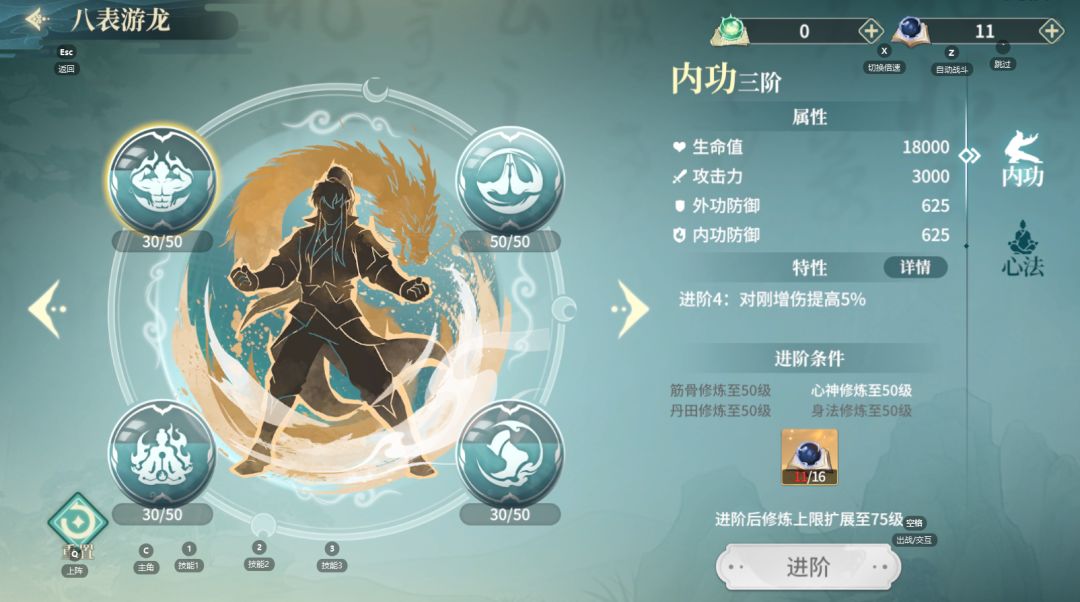 一共有筋骨、内功、丹田、身法四种可修炼的内功,增减生命、攻击、双防属性,通过消耗通息法提升内功等级;等级达到上限后,需要消耗逍遥诀来突破,突破阶段可提升特殊属性。