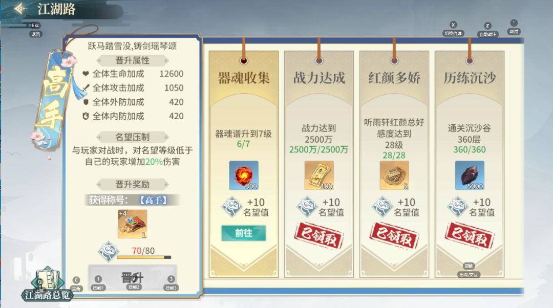 完成指定任务,可提升自己的江湖称号,从【新秀】直到【武极】。提升江湖称号可以获得晋级属性,从而提升战力,但最重要的一点是【名望压制】,与玩家对战时,对名望等级低于自己的玩家玩家增加20%伤害!