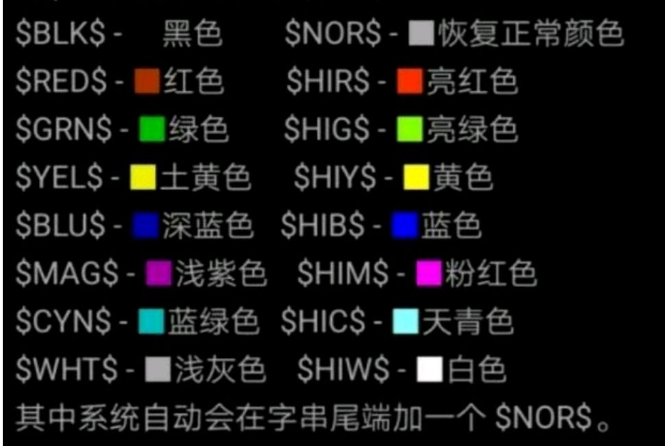 $BLK$ 黑色 $NOR$ 原色 $RED$ 红色 $HIR$ 亮红 $GRN$ 绿色$HIG$ 亮绿 $YEL$ 土黄 $HIY$ 黄色 $BLU$ 深蓝 $HIB 蓝色$MAG$ 浅紫 $HIM$ 粉红 $CYN$ 蓝绿 $HIC$ 天青 $WHT$ 浅灰 $HIW$ 白色
