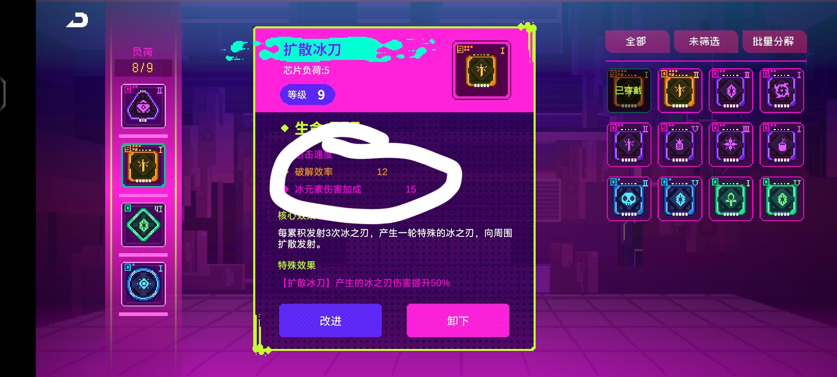 芯片有两种可以耍的属性,特殊效果无法更改,仅能通过不停刷看运气,可以更改的为上面的几条