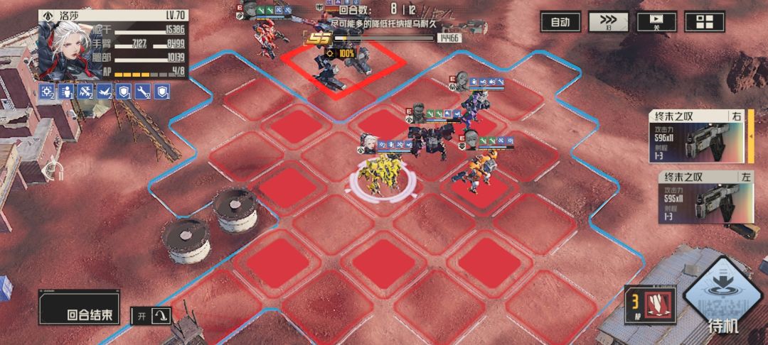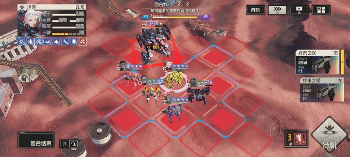 威廉重机枪,架起起后带群攻扫小机器人,满血状态死不了,扫完了待机,有不屈的明日香和零收一下。有的小机器人会自爆,需要分散一点躲开,可以悔棋提前把威廉包围起来,还有的免疫一次攻击(机器人身上的提示不明显不好分辨)。其他人全部带双机枪,最低要求有四把彩机枪,主手带彩机枪,副手带“改”就行。