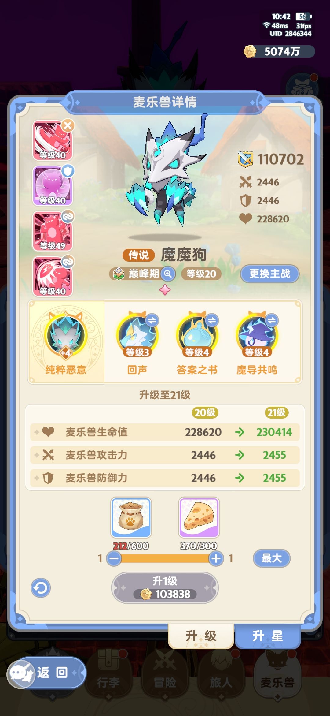 。这一期能更出来确实不太容易,为了赶在3转前达成通关中眠域这一目标,我花了不少钻石把猫猫凑出3223,把哈士奇冲到紫三洗出紫色攻属性贴纸,属性凑出50技爆42急速的标准面板(屯屯鼠好心疼),但抽完3次狗up后,试着带红1狗 技能5狗4智4雷刷了一次,从第3波起就堆怪清不完,等boss出来后伤害扛不住就寄了。后来调整属性技能又试了几次,结果都一样,过不了第8波,感觉是伤害不够,有些上头去非up池捞狗,30抽歪出了马,升到3级技能,看了下技能说明,似乎打群怪的情况下,比5级狗技能加的伤害数值还高,就换上试了一下,别说,你还真别说,就这么给过了,没找到就这么调整了一下技能搭配居然收获了意外惊喜