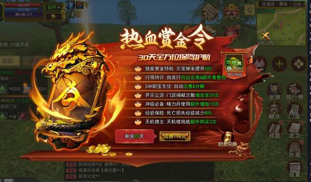 游戏的付费模式采用了点卡制度,玩家通过购买热血赏金令(即点卡时长)来享受游戏。这种模式简化了付费流程,降低了游戏的门槛,同时也保证了游戏的公平性。购买赏金令后,玩家可以享受包括提升元宝掉率、拍卖行自由交易、自动出售分解、增加门派捐献次数、额外使用精力丹、减少死亡损失经验等一系列特权。