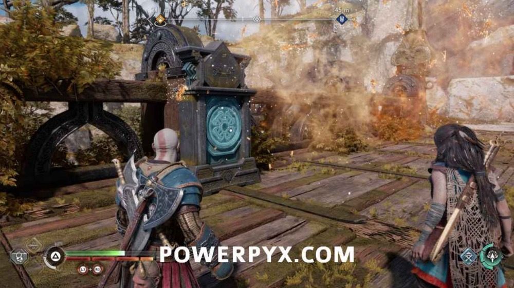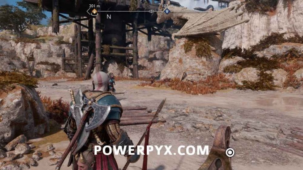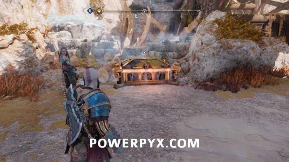 海滩上有3个符文,用斧子击打后可以开启诺伦三女神宝箱。