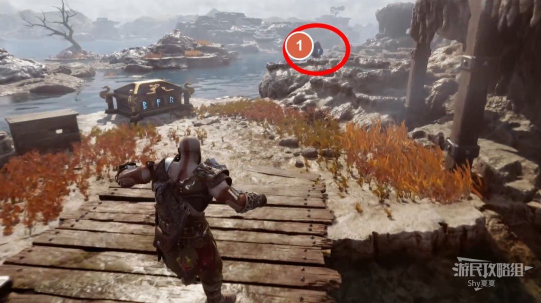 第三个要用斧头冻住宝箱正对着的喷泉(下图所示),然后利用混沌之刃跳到台子上(需要从右侧跳上去)。