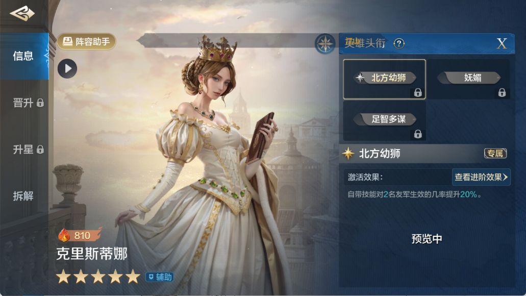 总的来说克里斯的机制,友军伤害主动技能发动率增加.增伤+或者技能距离+1,贞德降配版,某些情况甚至跟贞德差不多(带3个主动技能的情况,效果很强,贞德BUFF增伤只BUFF一次,这个可以BUFF3次)可以当一个贞德的下位替代,毕竟跟贞皇还是有差距的。她的适配体系:中速和快速主动体系,替代贞德,和贞德合体搭配一个单核也非常不错。搭配秦皇组成前三回合爆发也不错。这里给大家推荐一个队伍