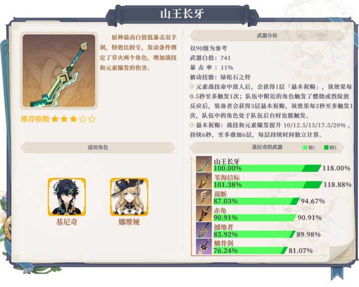1、山王长牙抽取建议:高达741攻击的白值,暴击11%,特效是触发燃烧和烈绽放,条件其实不苛刻但也很容易绕开,增加元素战技和元素爆发,娜维娅其实也能带。同样的,基尼奇对于这把武器的需求度也一般,如果面板配平跟苇海信标是一样的,只是苇海信标非常难配平。现在的武器一个比一个专,没有基尼奇这把武器约等于没用,所以不推荐抽