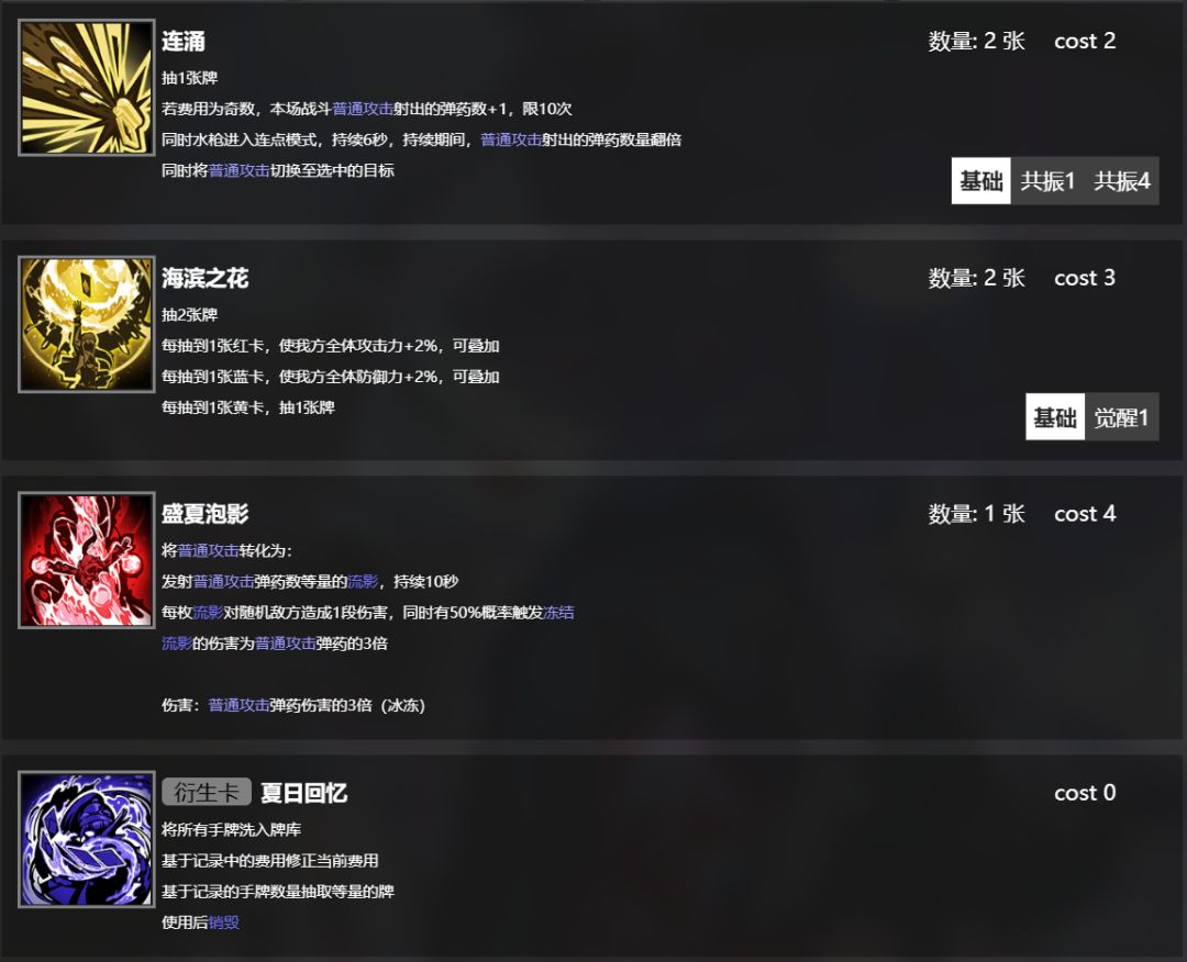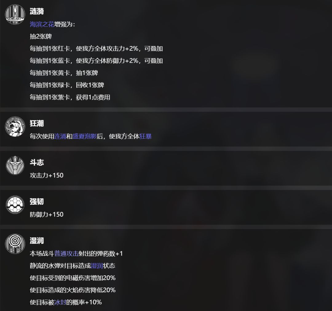 大招是一张4费红卡,队长技条件是抽8张牌,和伊洛纳类似的强化效果,强化普攻,是水静流主要输出手段。
