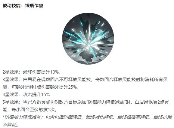 而叠加“防御能力降低减益”就会概率回复白居易2~4点能量,那防御降低减少益都包含什么呢?