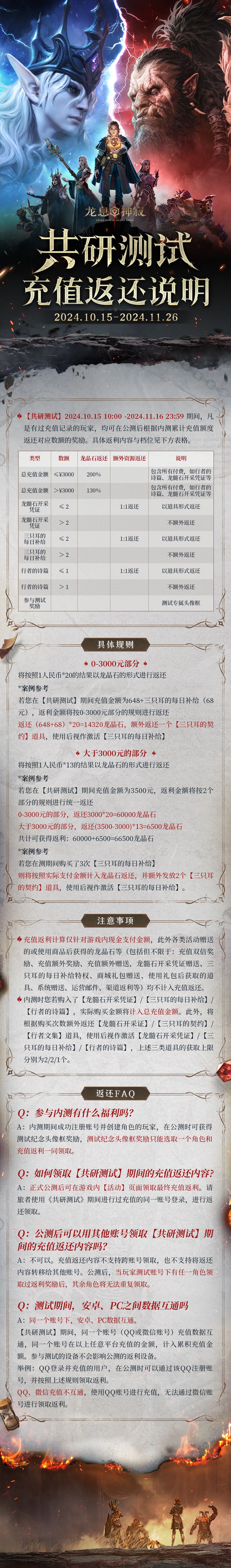 本次测试期间,所有累计充值金额将在游戏正式上线以后,按充值返还规则进行返还,返还账号需和测试期间充值账号保持一致,最高可享受高达