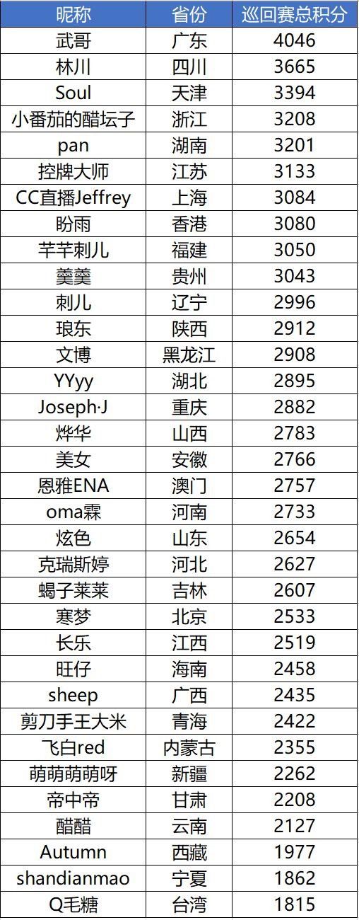 目前排名前两名的玩家都来自广东,分别是4046分的“武哥”和3718分的“喝醉的Hmin”!上周“广州站”的时候广东玩家发挥不佳,在周赛铩羽而归。而在本周的“武汉站”,他们强势归来,又一次占领了榜单前列!这种领先可以持续到什么时候呢?我们走着瞧!
