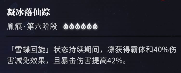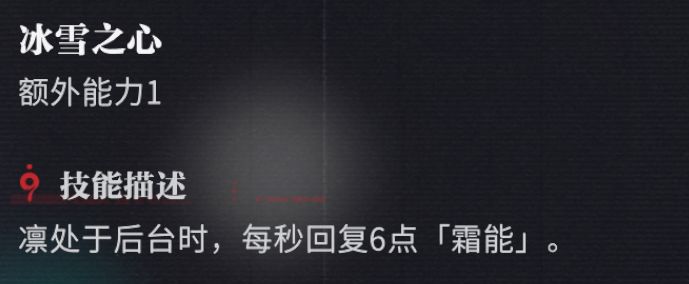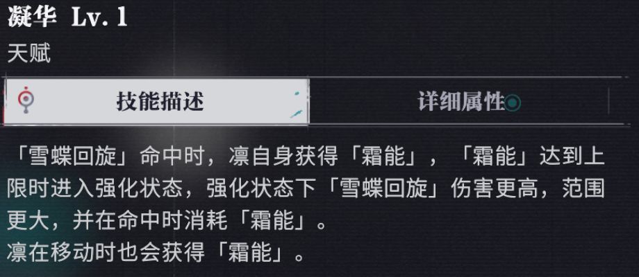 可以看到天赋说明的最后一句,在移动时也会获得霜能,每3米获得1点。在实战中他能给你回复的霜能并不多,大约可以让你多释放1次攻击。但最重要的是在爬塔和闯关的过程中,凛可以在终结怪物前提前调整自己的站位,为下一关破韧手更快的破韧提供必要条件,不要小看一点点的走位,在速推过程中,走位可也是要算时间的哦。