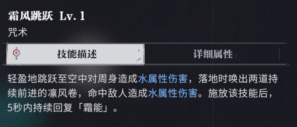 释放咒术后每秒回复10点霜能,持续5秒钟,共回复50点。该技能可以在雪蝶回旋发动的中间随时释放,且不影响雪蝶回旋的状态。雪蝶回旋攻击间隔是0.2秒,每次强化攻击消耗5点霜能,意味着每秒消耗25点霜能,霜风跳跃可以在强化雪蝶回旋发动2次攻击后协同发动,且不用担心溢出,等于变相延长了每次爆发输出的时间。
