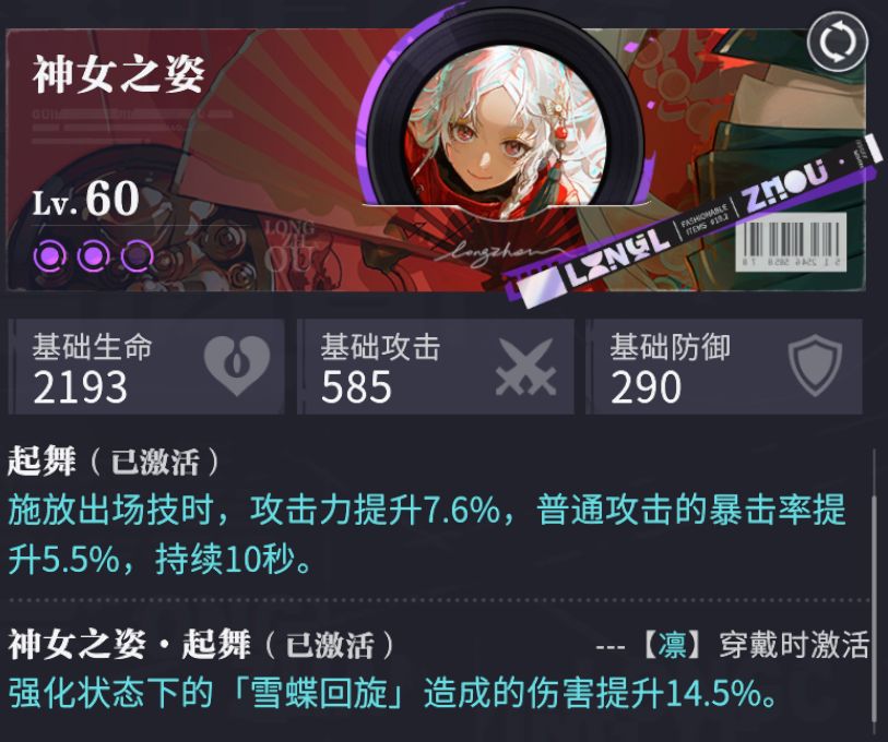 凛的核心机制是通过雪蝶回旋、咒术、后台积攒以及移动回能的方式充能霜能,霜能充满后强化雪蝶回旋扩大攻击范围提高攻击倍率(提升60%的输出)。在实战中通常在一轮破韧加支援手挂buff后凛的霜能都能在后台回复满(最多17秒)。