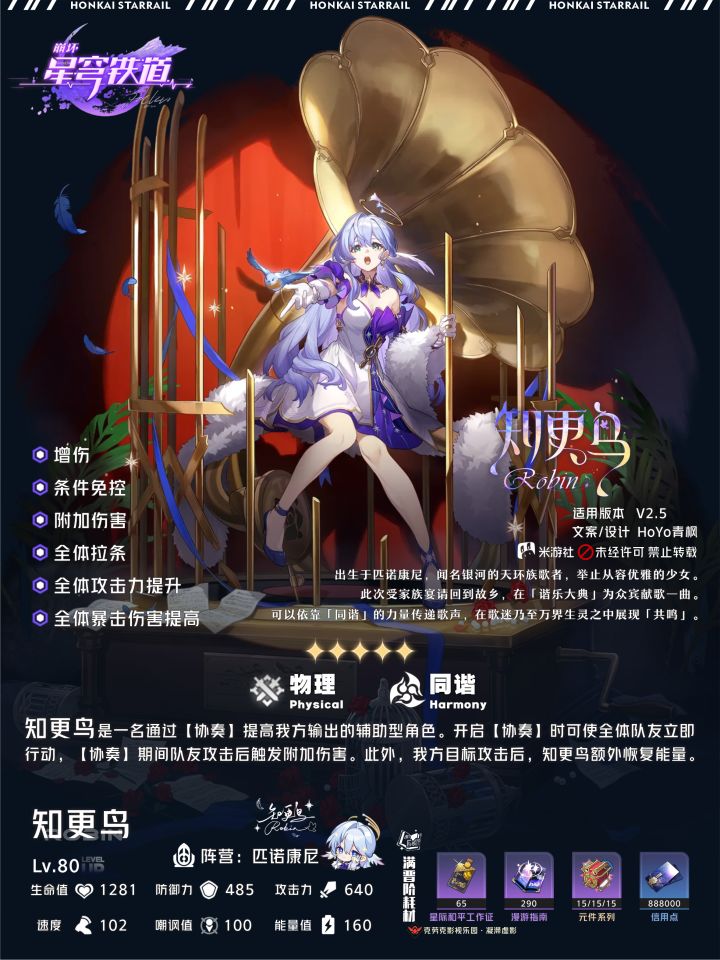 知更鸟是一名物理属性-同谐命途角色,具备全队增伤、加攻、暴伤、全队拉条以及附加伤害的辅助特性,对攻击频率较高的阵容有着突出的增益表现,大幅提升队伍的短轴爆发输出,更适合于辅助追击队、双c阵容,对追击队有特化辅助表现,目前独有的全队强拉条,为我方带来更多行动增益,在有限的回合内打出更多的有效输出,回合制中拉条的含金量懂得都懂,这也为深渊竞速、凹0T创造更高的可操作性;
