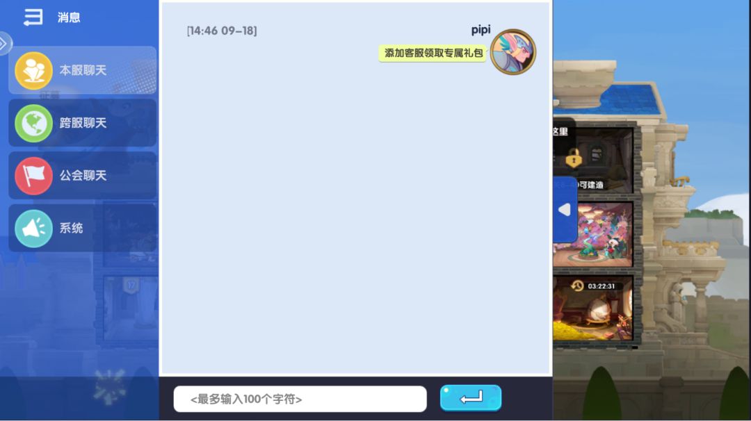 在游戏中的聊天中发送:添加客服领取专属礼包。