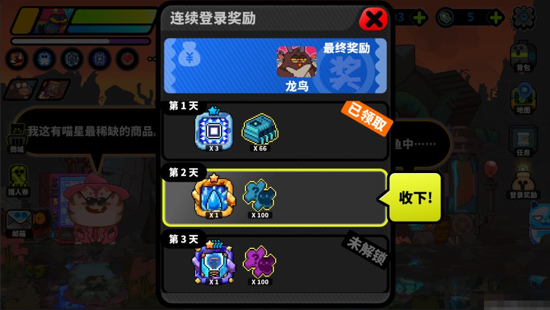 喵星正式开放,喵星上的大家早就准备好了接客之礼,猎人在游戏内每天登录可领取登录奖励,第5天还能获得史诗角色-龙鸟!
