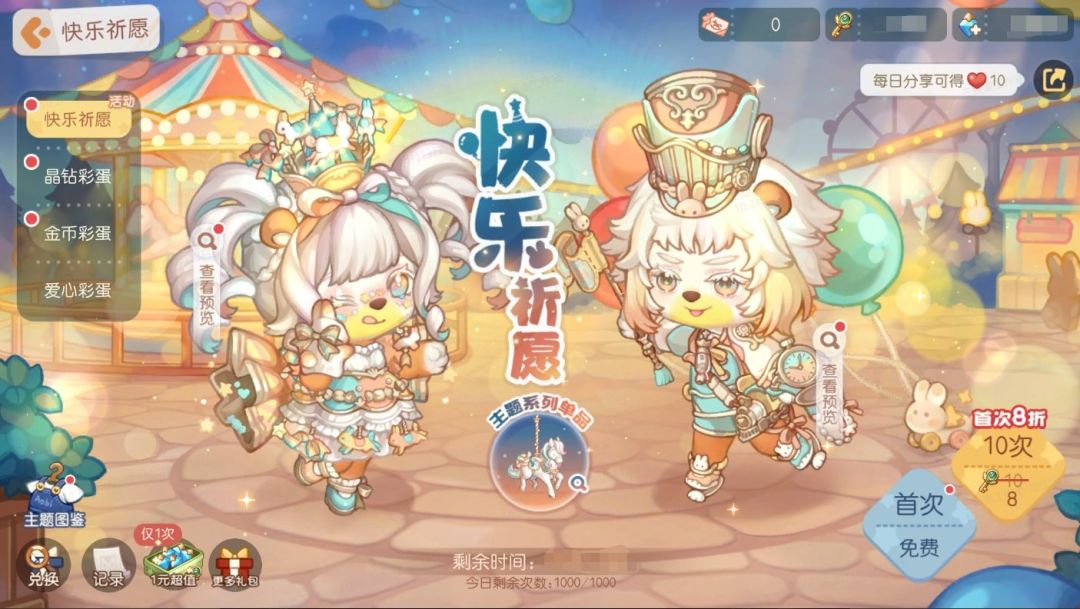 游乐园主题彩蛋“快乐祈愿”限时登场!彩蛋上新送福利!新彩蛋开启后可免费抽取一次,首次使用时空之钥和晶钻抽取10连还可分别享受首次8折优惠!彩蛋奖励包含晨星品质时装「糖果兔兔套装」、「跳跳萌兔套装」以及晨星品质家具套装「奇妙乐园」系列等全新礼物!还有典藏品质的「扭蛋哥哥套装」、「扭蛋妹妹套装」 、「奇妙旋转木马」装扮散件和「快乐制造厂」家具散件等奖励限时获取哦!
