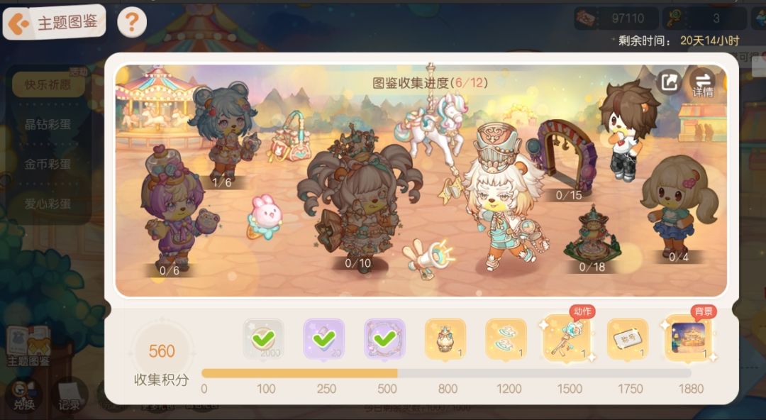 主题图鉴活动开启!活动时间内完成收集主题图鉴内收录的装扮部件,即可获得对应收集积分,前来收集解锁对应的进度奖励吧。奖励包括丰厚的晶钻和装扮物品,达成对应进度可解锁头像框「奇妙游乐园」、家具散件「奇妙木马彩蛋」、足迹「乐园木马足迹」、动作部件「忘忧魔法糖」、称号 「掌管快乐的小熊」等奖励,达成最终积分进度还可领取背景卡「奇妙乐园背景」。