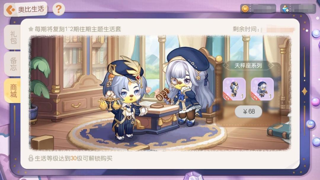 活动介绍:奥比生活全新上架,舒适生活、精致生活、豪华生活三种礼包随心选择!舒适生活活动周期内,完成每日备忘,达到对应礼包等级即可解锁等级奖励。精致生活活动周期内,升级解锁精致生活礼包,立即赠送礼包等级10级。完成每日备忘,达到对应礼包等级即可解锁等级奖励,精致礼包奖励包括时装「倒吊之心套装」「开朗愚者套装」、装扮散件「快乐小丑面具」「倒吊星球背包」「忠诚小狗玩偶」、家具「愚人勇气之旅」「倒吊精灵舞台」、背景卡「倒吊愚者舞台」及丰厚的晶钻彩蛋锤、高级彩虹星星和收集季卡盒等其他珍贵礼物。豪华生活活动周期内,升级解锁豪华生活礼包,除享有精致生活礼包相同权益外,还立即赠送礼包等级20级、专属头像框「倒吊愚者」、「萌二驾到」收集季自选典藏卡盒、300晶钻福利,享有每日备忘经验20%加成。(若已购买精致礼包,升级豪华礼包时赠送礼包等级为10级)返场商城奥比生活星座系列第十二期装扮返场,感兴趣的小奥比可不要错过啦!活动期间内,小奥比可以通过升级「奥比生活」塔罗生活系列第五期以激活两套返场装扮的购买资格,本次返场的装扮为「天秤座守护套装」「天秤座审判套装」,已开启染色功能。