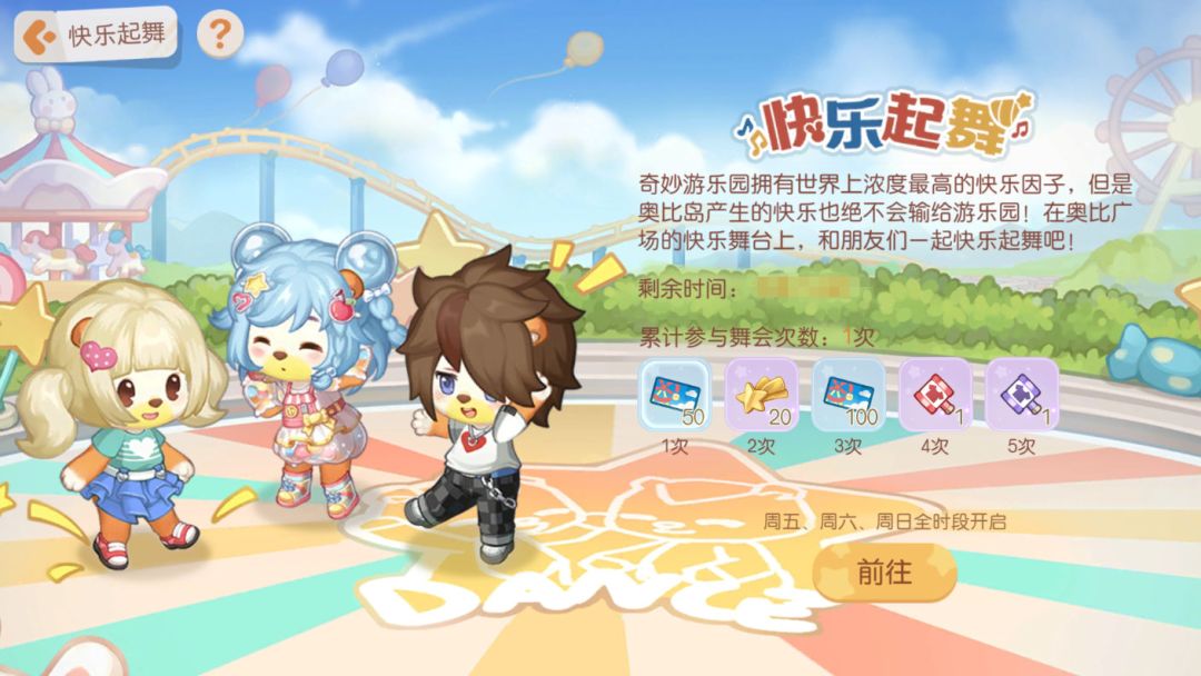 活动介绍:奇妙游乐园拥有世界上浓度最高的快乐因子,但是奥比岛产生的快乐也绝不会输给游乐园!在奥比广场的快乐舞台上,和朋友们一起快乐起舞吧!
