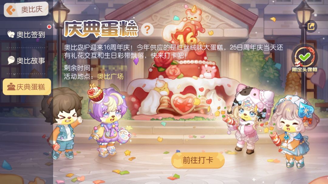 奥比岛IP迎来16周年庆!今年供应的是红丝绒味大蛋糕,25日周年庆当天还有礼花交互和生日彩带飘落,快来打卡吧!打卡分享还能获得头像框「快乐无忧」奖励哟~