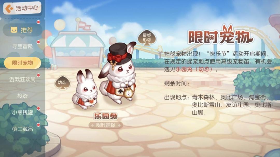 神秘宠物出现!“快乐节”活动开启期间,在规定的捉宠地点使用高级宠物笛,有机会遇见乐园兔(幼态)。