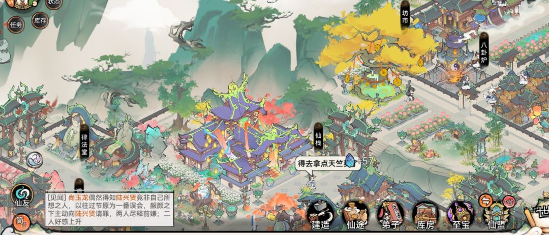 图三:在弟子区下方,分别是发布任务悬赏台与收藏典籍的藏经阁。