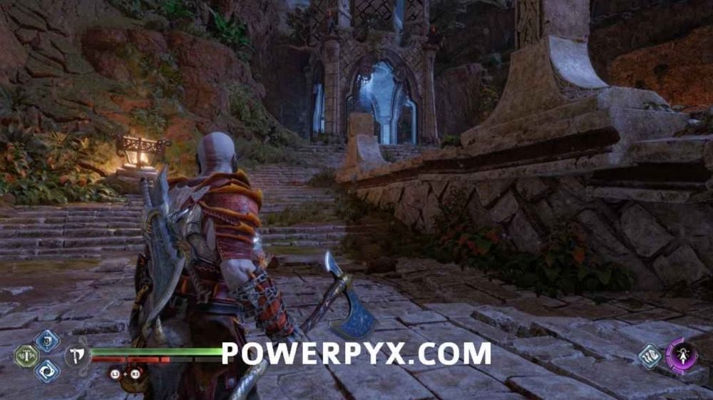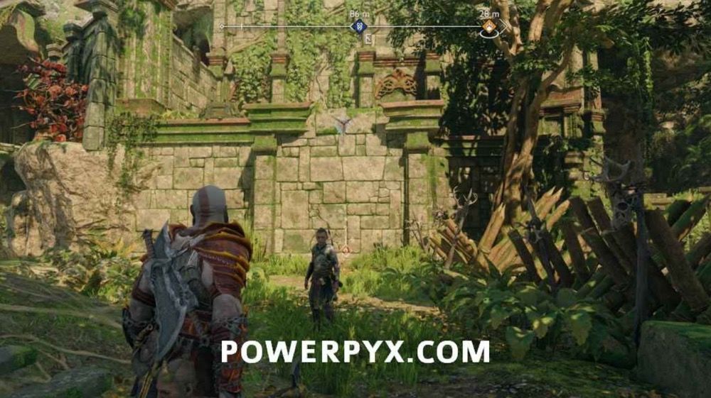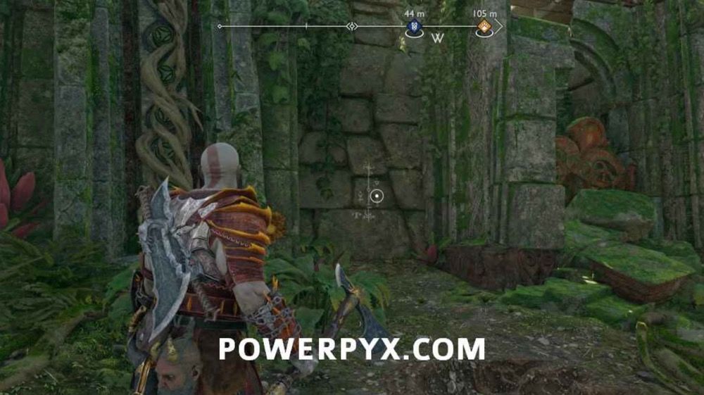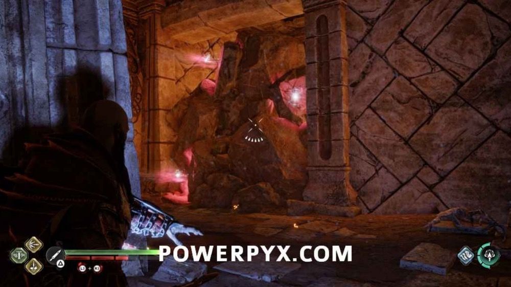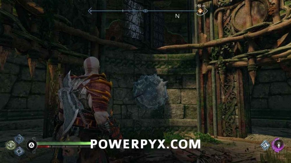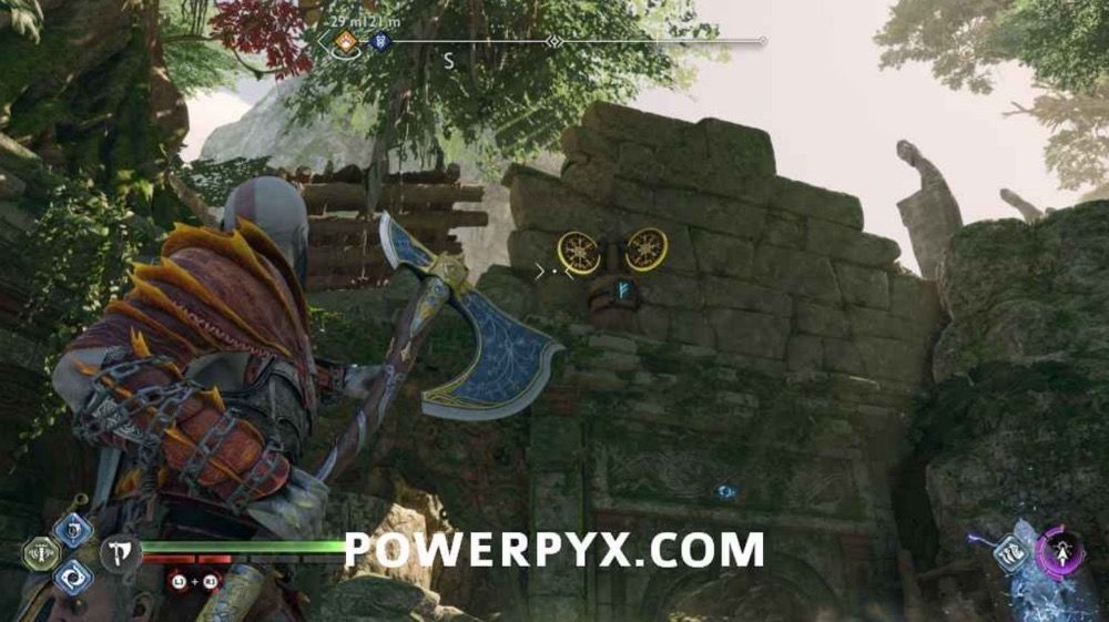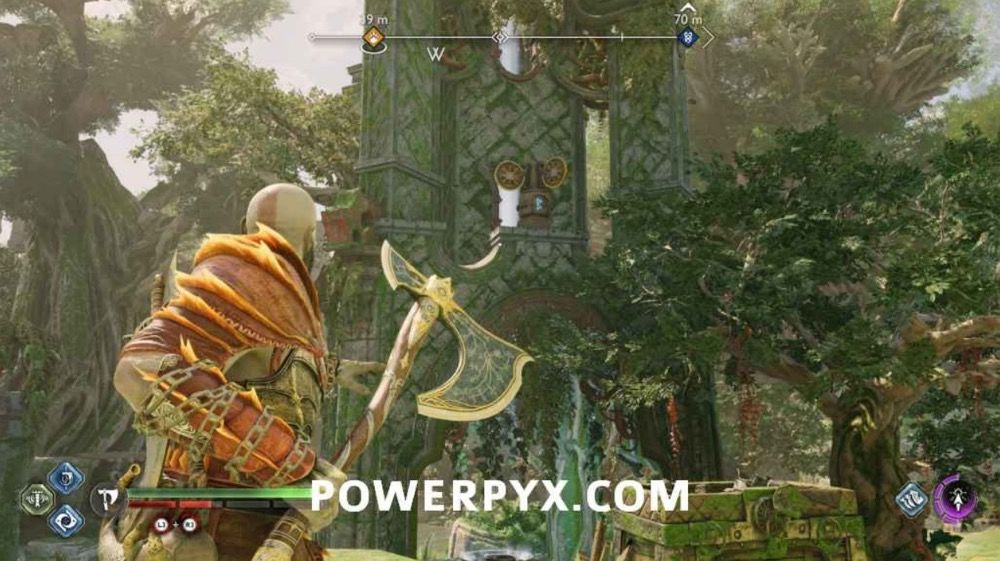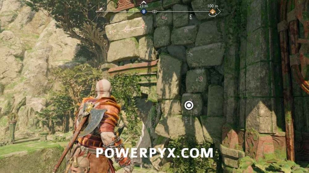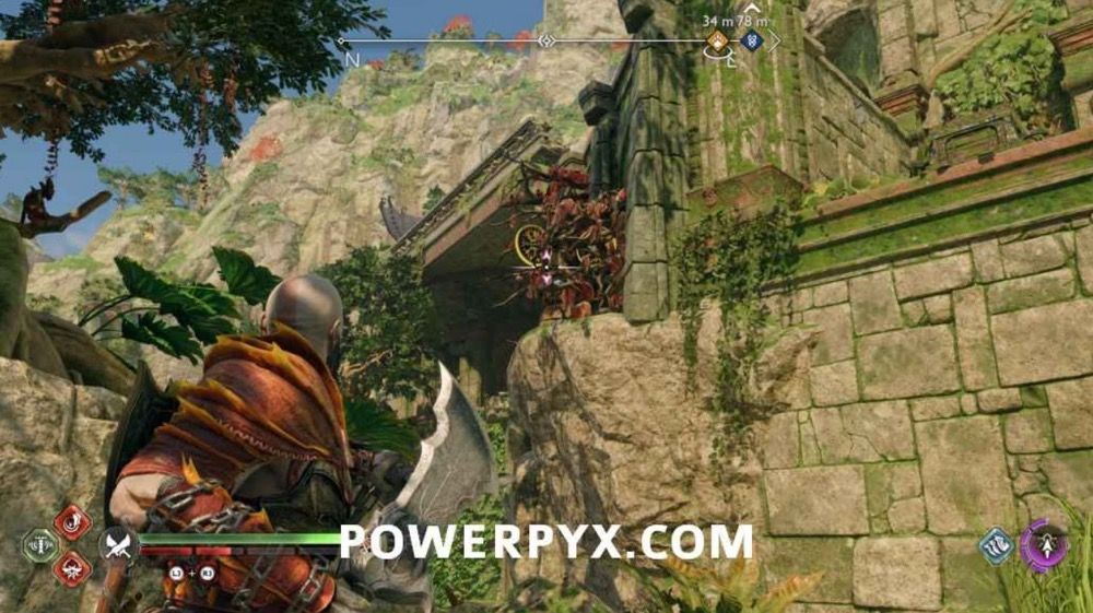 往上爬,此处会遭遇一个BOSS,不过打它几下它就跑了。先不要追,击打附近的3个符文,开启诺伦三女神宝箱。