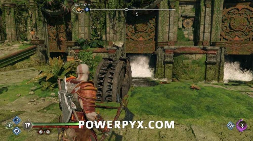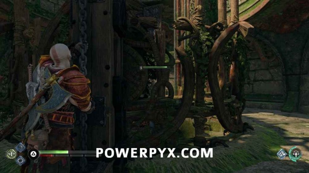 烧掉荆棘,清理掉敌人后,操作齿轮升起闸门,使河流重新流动。