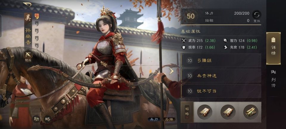 孙尚香战法:弓腰姬+兵贵神速+锐不可当。韬略库:慢战善本+久战善本+武女传(专属)。弩兵特性劲弩,专精点亮弦无虚发。
