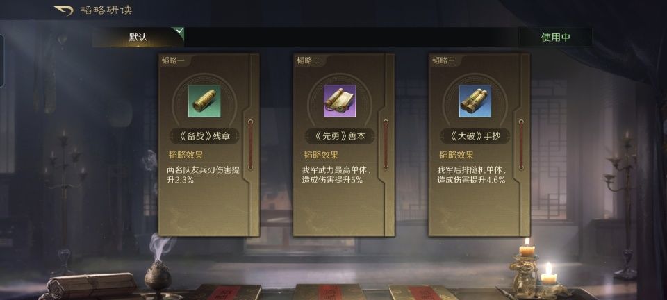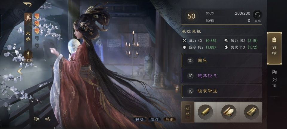 大乔战法:国色+避其锐气+轻装驰援。韬略库:备战残章+先勇善本+大破手抄。长枪兵特性破敌,专精点亮坚定不移。