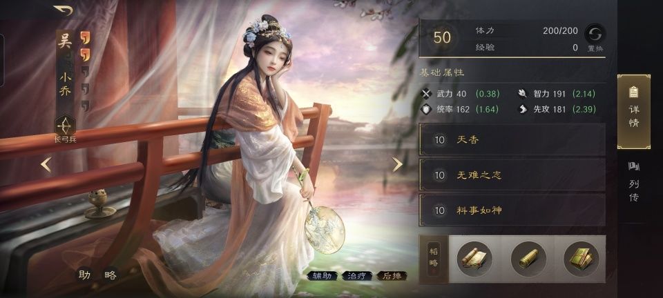 小乔战法:天香+无难之志+料事如神。韬略库:机动善本+励心残章+公瑾信(专属)。长弓兵特性洞悉,专精点亮袍泽同心。二乔姐妹身为方圆阵的前排,一起承担着掩护孙尚香的重任,故而放在一起讲。大乔的职责不必多说,她放眼整个吴国阵营都是最专业的肉盾,战法侧重团队防守,兵书则重点提升全队武力值最高的孙尚香。小乔的心思明显更加复杂,通过兵书的叠加,天香的发动率最高可以达到61.3%。另一个主动战法料事如神,虽然没能吃到公瑾信的加持,却也能把发动率最高提升到51.3%,过半和不过半的差距还是很大的,技穷对手的成功率会高出很多。