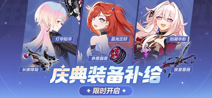 庆典装备补给限时开启,「深空定锚·曙光」的推荐搭配驱动核心武器「赤星霹雳」与「晨光正好」圣痕套装、「享乐狂宴·邀影」的推荐搭配链刃武器「夜宴蔷薇」与「珀凝华影」圣痕套装、「破弃孤光·逐影」的推荐搭配速射弩武器「长夜锋焰」与「灯华如淬」圣痕套装获取概率提升!