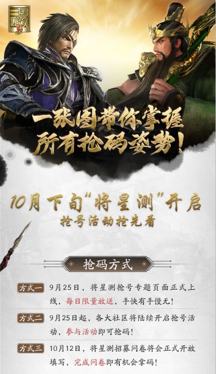 1、转发“一张图带你掌握所有抢码姿势”海报到社交平台+一句话对《真・三国无双 霸》送祝福(平台包括群,社区论坛等)