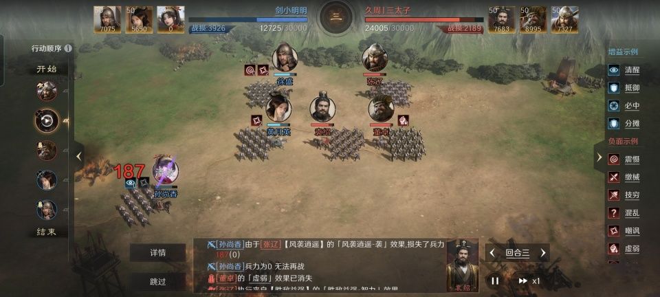 袁绍战法:合聚群雄+指点乾坤+来好息师。韬略库:兵教善本+威帅善本+大破善本。长弓兵特性洞悉,专精点亮袍泽同心。具体到这场战斗,全队武力、先攻最高的角色是张辽,智力最高的是袁绍。对面主要受到张辽打击的,是武力最低的黄月英和先攻最低的徐盛。孙尚香智力最低,所以会被袁绍针对。除了精确制导,袁绍还肩负着给全队提供治疗的重任。这也是为什么,他们要排成一字阵,如此才方便来好息师进行前排回血。