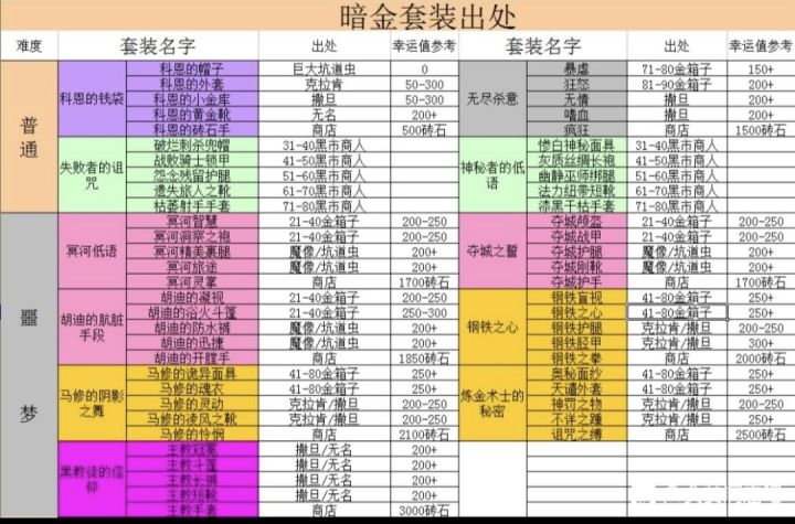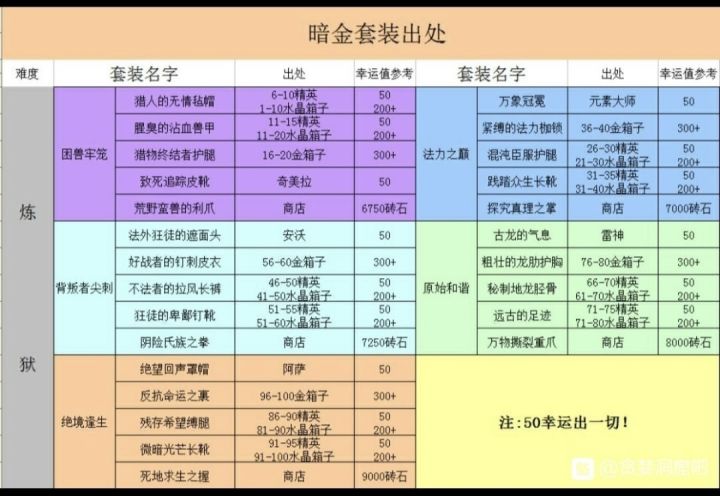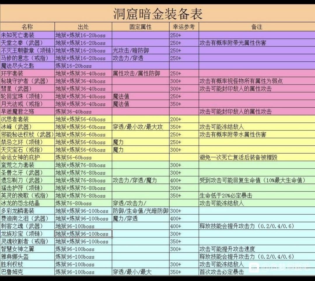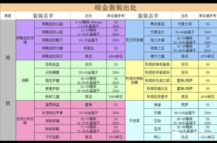 洞窟普通、噩梦、地狱、炼狱、裂缝,套装、散件掉落整合,欢迎补充。