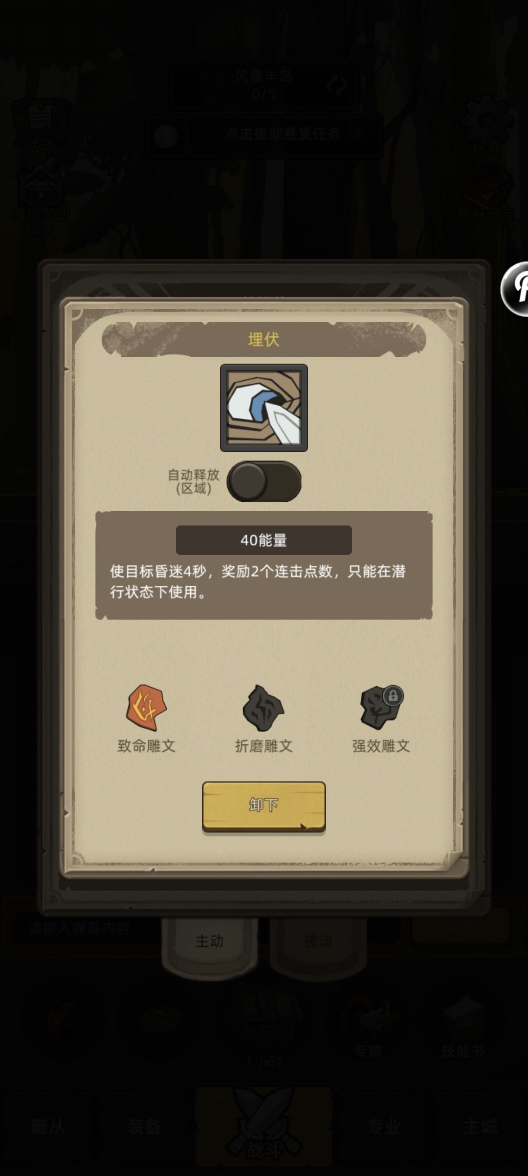 技能循环:随从眩晕3s+埋伏眩晕4s(雕文+1s)+幽暗之刃(100%破甲)+根据技能急速穿插技能(攻击>boss护甲情况下)+消失→等待随从眩晕