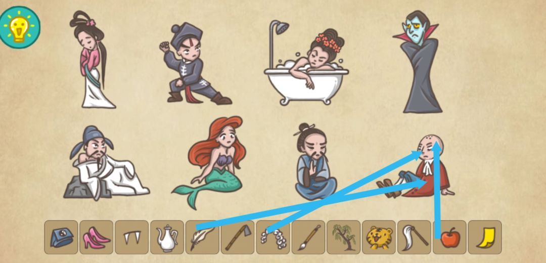 把牛扔水里,旋风放小麦上,蚂蚁放树上,僧人放墙后,松鼠放鱼上,女人放男人上,太阳放小狗上,把狮子尾巴往外拖,点击墙后的龙角,把马放到龙上,点击鸡,把蛋放到塔上