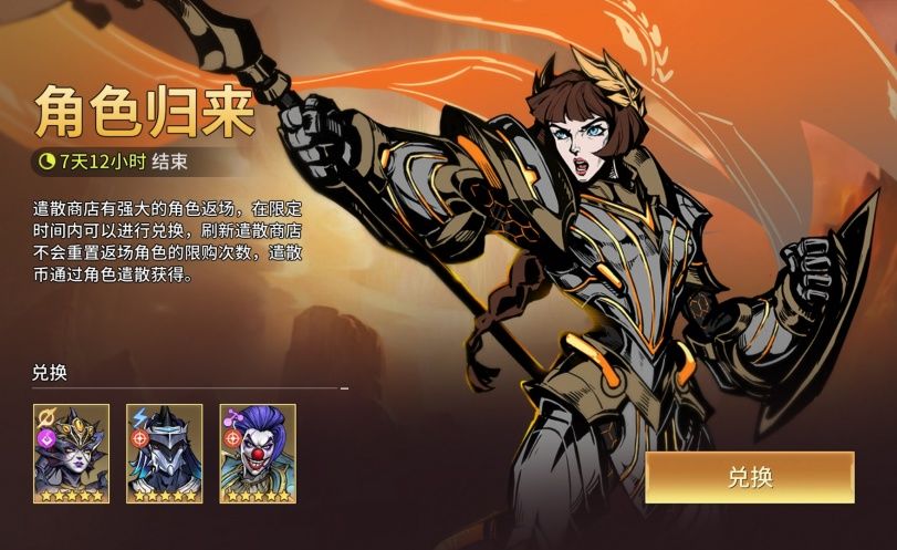 遣散商店有强大的角色返场——库拉、凯撒、【愚者】法努科,在限定时间内可以进行兑换,刷新遣散商店不会重置返场角色的限购次数,遣散币通过角色遣散获得。