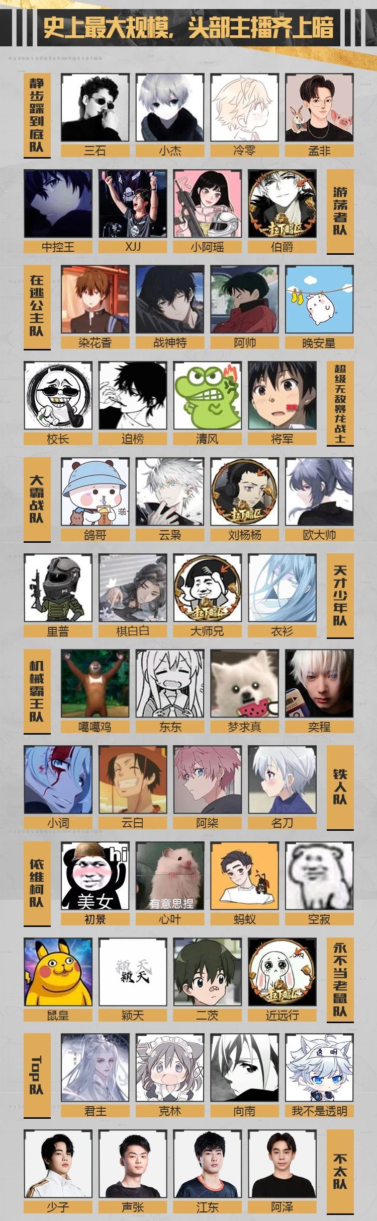 “静步踩到底队”、“游荡者队”、“在逃公主队”……12支由暗区顶流组成的战队集结完毕,组成史上规模最大最豪华的大金杯阵容。这48位头部主播之间究竟会碰撞出怎样的火花?在实力与运气的较量中,冠军最终会花落谁家?敬请期待9月20日晚19:00暗区大金杯!