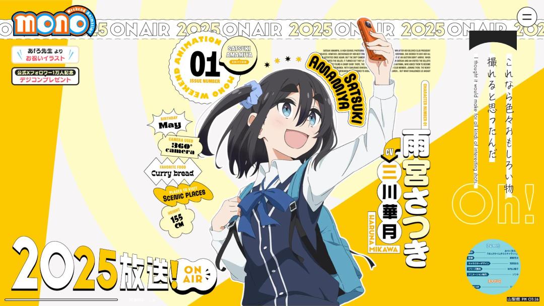 据了解《mono女孩》将由Soigne负责制作,爱敬亮太担任导演,米内山阳子作为编剧,角色设计则由宫原拓也操刀,女主角雨宫五月的声优则为三川华月。