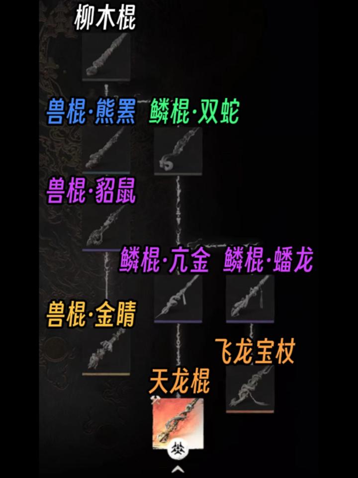 独门妙用:一定程度增加所有立棍招式的伤害;使出三、四段蓄力立棍时,引出天龙,劈下落雷