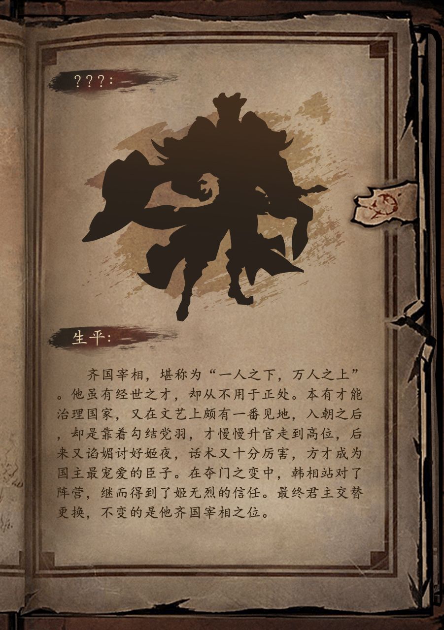 齐国宰相,堪称为“一人之下,万人之上”。他虽有经世之才,却从不用于正处。本有才能治理国家,又在文艺上颇有一番见地,入朝之后,却是靠着勾结党羽,才慢慢升官走到高位,后来又谄媚讨好姬夜,话术又十分厉害,方才成为国主最宠爱的臣子。在夺门之变中,韩相站对了阵营,继而得到了姬无烈的信任。无论是才能还是话术,让人感叹的是君主交替更换,不变的是他齐国宰相之位。